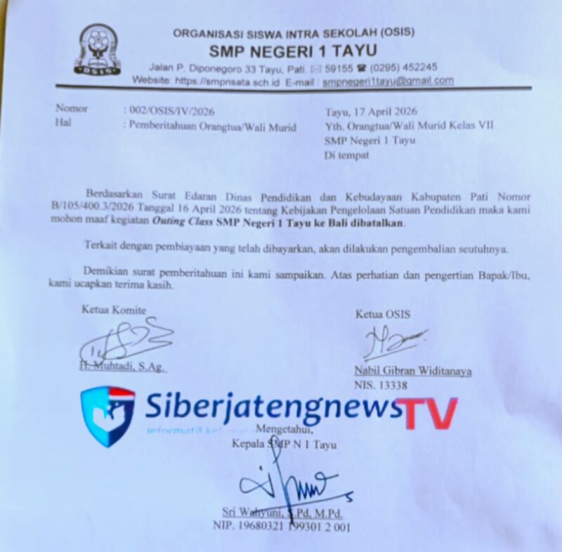 TAYU –Siberjatengnewstv _ SMP Negeri 1 Tayu resmi membatalkan kegiatan Outing Class (Omting) yang direncanakan akan dilaksanakan ke Bali. Pembatalan ini dilakukan sebagai tindak lanjut dari Surat Edaran Dinas Pendidikan dan Kebudayaan Kabupaten Pati Nomor B/105/400.3/2026 tanggal 16 April 2026 tentang Kebijakan Pengelolaan Satuan Pendidikan.