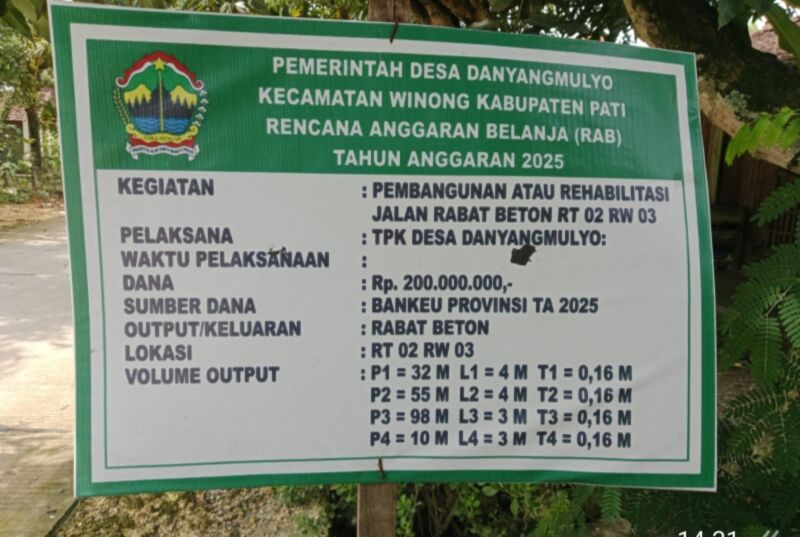 “Pembangunan di kelola oleh tpk desa danyangmulyo dan bersumber dari anggaran bankeu provinsi. Baru sekitar beberapa bulan selesai, tapi sudah banyak yang retak. Kami menilai ini akibat kurangnya pengawasan dan teknik pengerjaan di lapangan,” ujarnya.